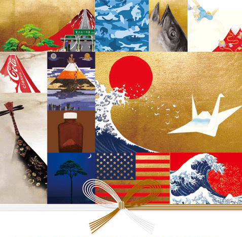 北斎の「冨嶽三十六景」の図柄を、ユーモアと遊びと洒落に溢れた着想で制作した本シリーズは、伝統文化と現代日本の違いを観る者に気付かせてくれます。このシリーズは、富士山が世界文化遺産に登録されたことを記念して作られました。富士山は海外に飛び立ち、世界中でたくさんの友達を作ってゆくことでしょう。